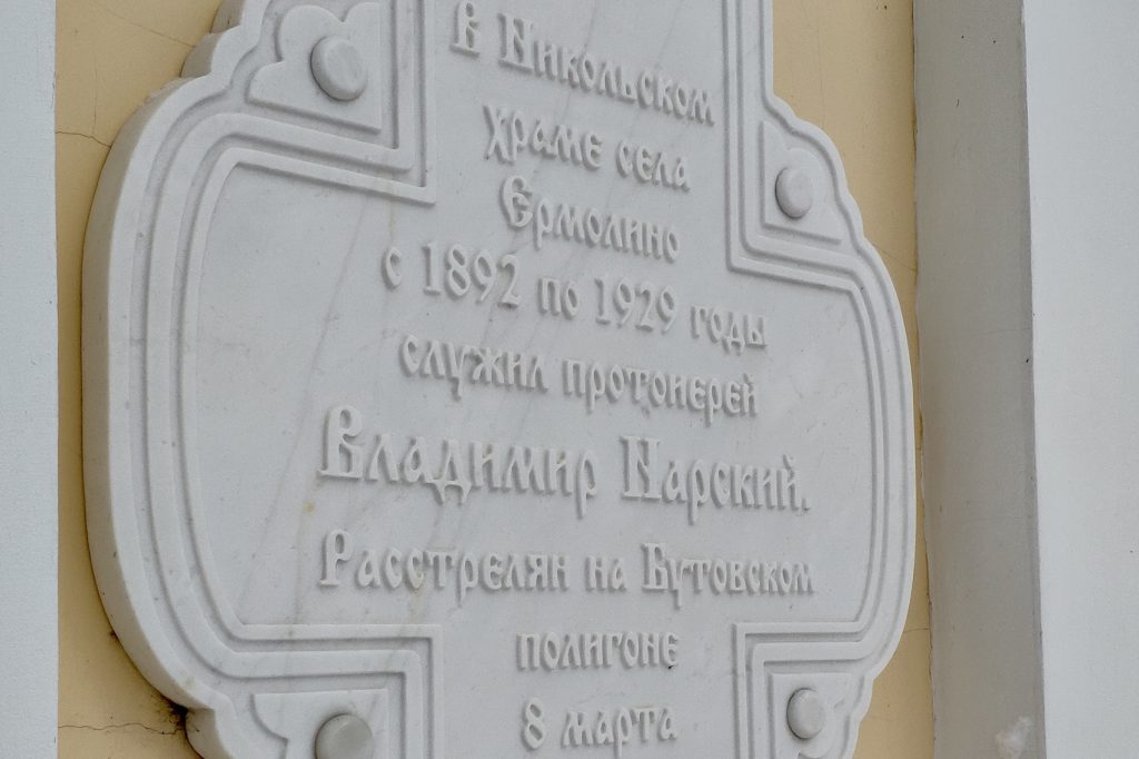 8 марта 1938 года на Бутовском полигоне был расстрелян Владимир Алексеевич Нарский, настоятель Никольского храма с. Ермолино (1892-1929 гг.), последний дореволюционный священник храма. На стене у входа в Никольский храм открыта памятная доска священнослужителю.