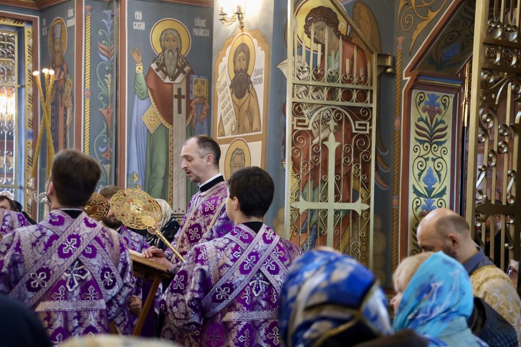 На малом входе владыка Аксий вручил Патриаршие и Епархиальные иерархические награды, которых клирики благочиния были удостоены ко дню Святой Пасхи. После сугубой ектении была вознесена молитва о восстановлении мира.