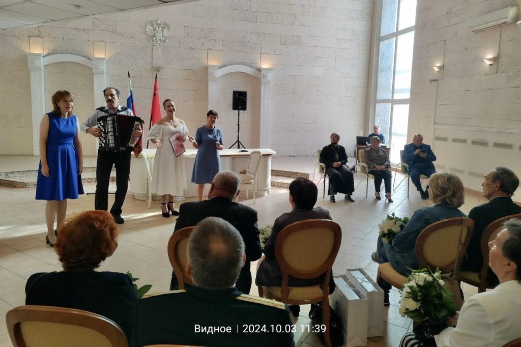 3 октября 2024 года в ЗАГСе г. Видное прошло чествование юбиляров семейной жизни, проживших в браке 50 и 55 лет. Настоятель Покровского храма г. Видное иерей Андрей Андреев принял участие в поздравлении супругов. Священник поблагодарил пары за высокий пример любви, пожелал им крепкого здоровья и долгих лет жизни.