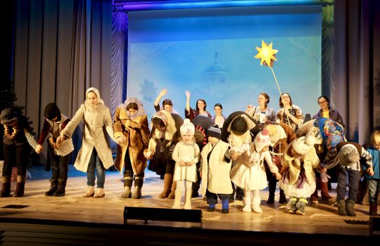 После Божественной литургии все отправились в прекрасный зал Дома культуры на спектакль учеников Воскресной школы, который дети в течение месяца репетировали со своим творческим руководителем Алёной Дементьевой. Во время спектакля артисты смогли неожиданно попробовать себя в импровизации — из-за непредвиденной технической заминки, а трогательные малыши замечательно без подсказок сыграли христославов. Родители и прихожане храма присоединились к спектаклю, исполнив радостные рождественские колядки. После выступлений и вручения подарков всем детишкам, зрители вместе с артистами отправились на улицу угощаться традиционным горячим чайком и вкусными пирожками.