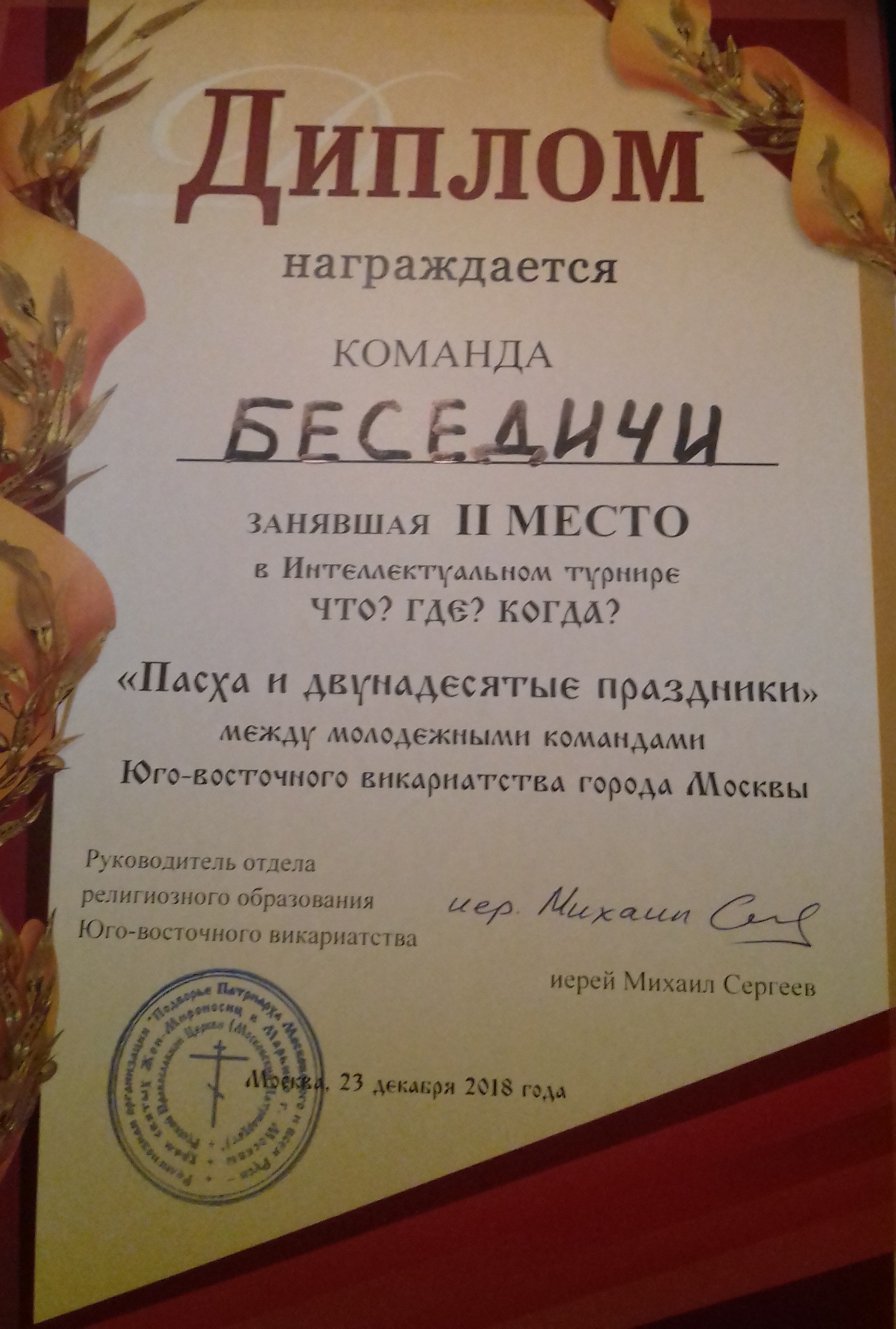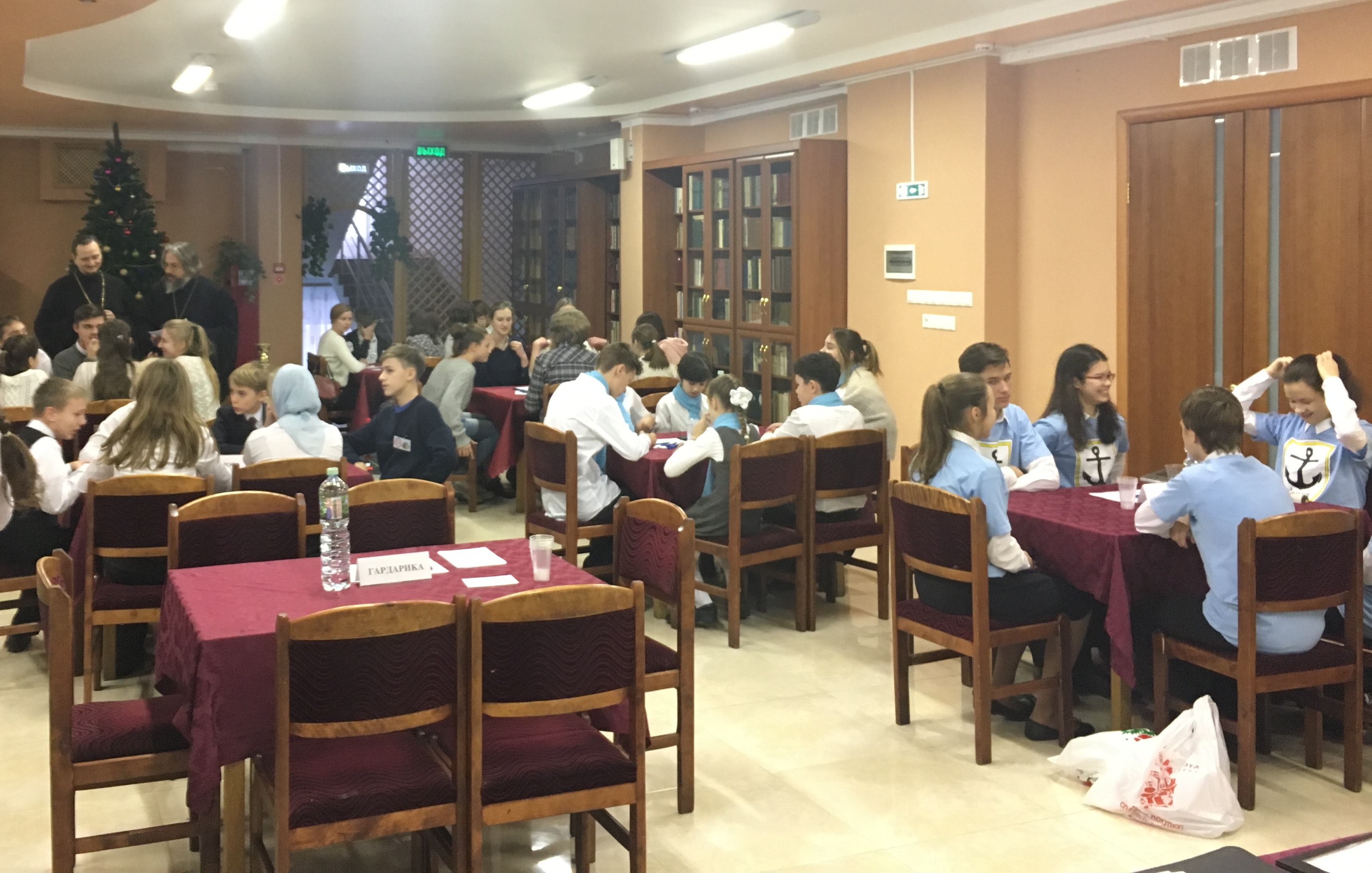23 декабря в Социальном доме №4 Марьино отделом религиозного образования Юго-Восточного викариатства г. Москвы была проведена интеллектуальная игра «Что? Где? Когда?», темой турнира была: «Пасха и двунадесятые праздники».
