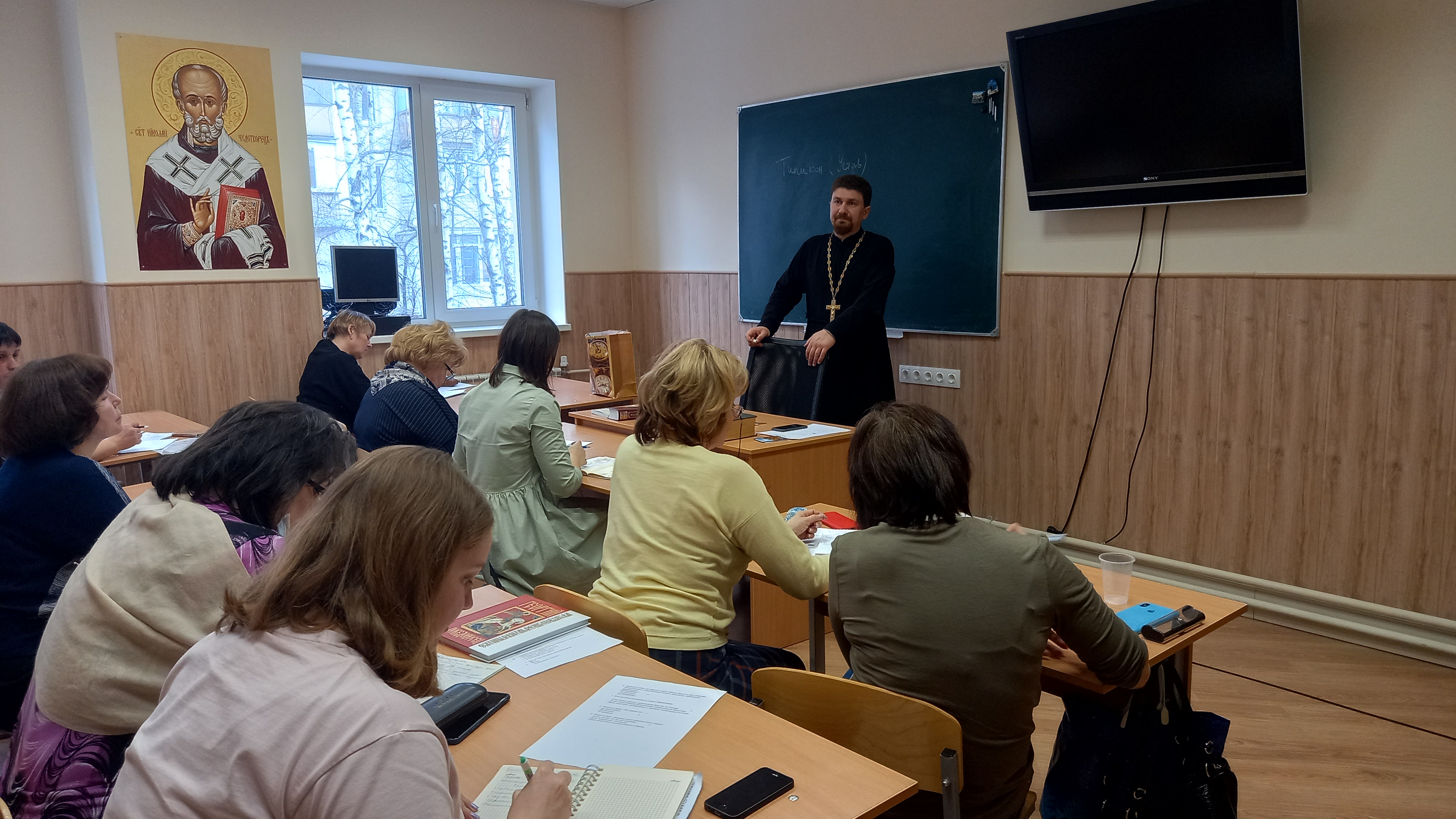 Педагоги с интересом послушали рассказ священника Николая Шапорева о суточном, седмичном и годовом богослужебных кругах, ознакомились с книгами, которые используются при составлении основных богослужений.