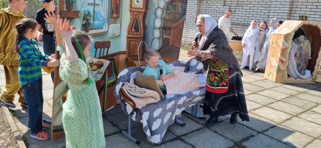 Праздник продолжился на прихрамовой территории, где приходская воскресная школа показала гостям спектакль «Две горошины». В его постановке принимали участие председатель совета местного отделения общероссийского движения детей и молодёжи «Движение первых» Ксения Жукова и другие члены организации.
