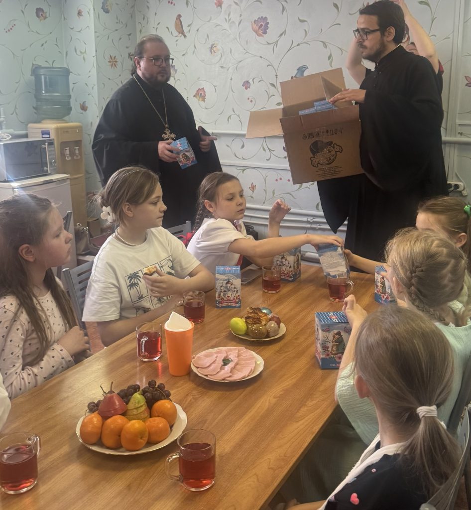 После сытного обеда батюшки передали всем присутствующим детям шоколадные яйца, подаренные АНО «Колыбель».