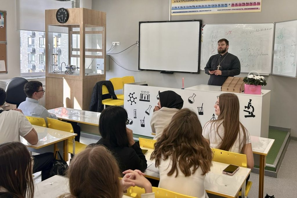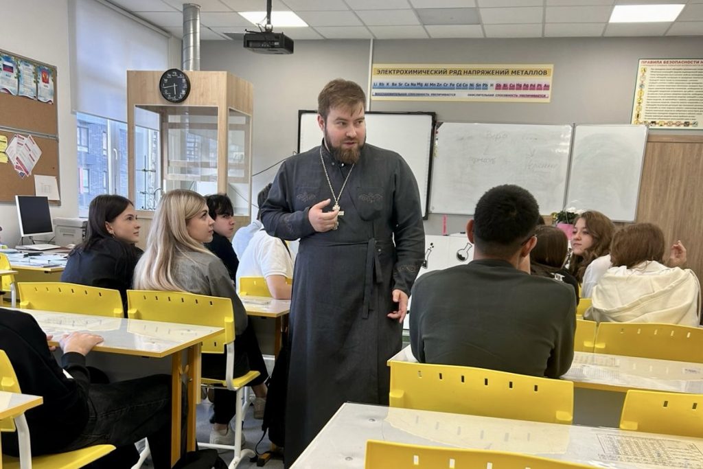 24 сентября в рамках проекта «Диалог со священником» в образовательном центре «Успех» посёлка городского типа Дрожжино, Ленинского городского округа, была организована встреча учащихся 10 класса с клириком Александро-Невского храма города Видное иереем Димитрием Топчиевым.