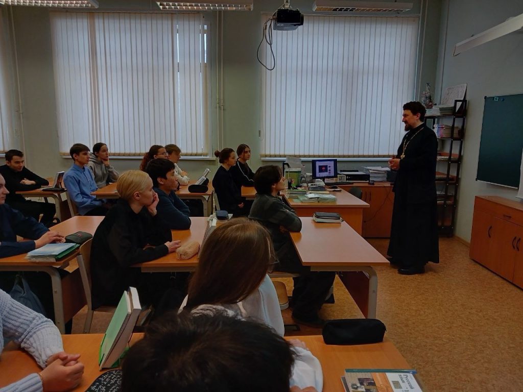 28 января в МБОУ «Видновская СОШ №2» в рамках духовно-просветительского проекта «Диалог со священником» состоялась встреча со старшеклассниками. Перед учащимися 10 класса выступил иерей Николай Шапорев, настоятель Александро-Невского храма г. Видное. Очередную встречу отец Николай посвятил теме «В чём смысл жизни человека?».