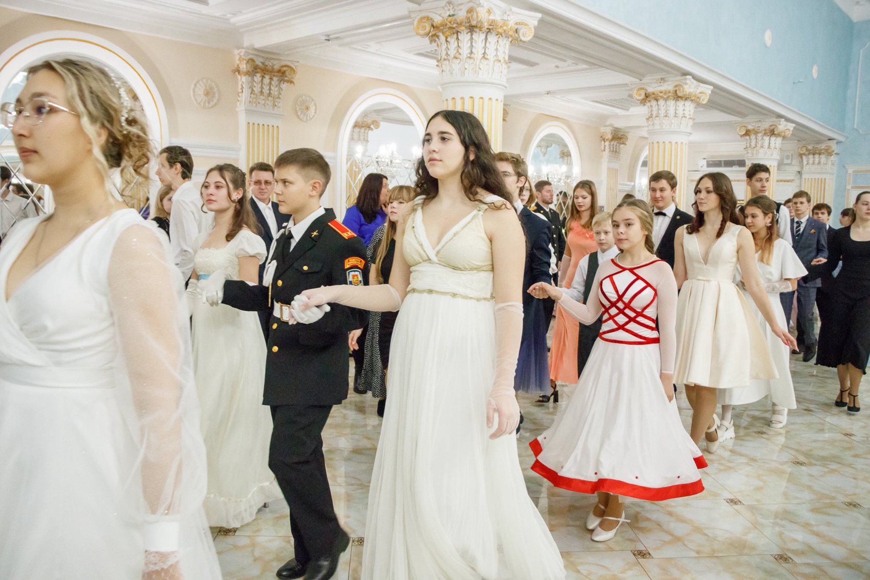 Далее в ходе двух отделений бала юноши и девушки под руководством ведущей Маргариты Рахманько разучивали танцевальные движения и фигуры, а затем танцевали под звуки вальса, марша и польки.