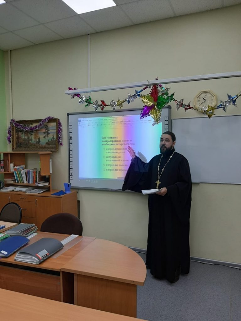 Темой беседы была выбрана самими школьниками: «Методы вербовки и удержания адептов в тоталитарных сектах». Батюшка рассказал об опасности попадания в подобные псевдообщины и о том, что нужно отвечать сектантам.