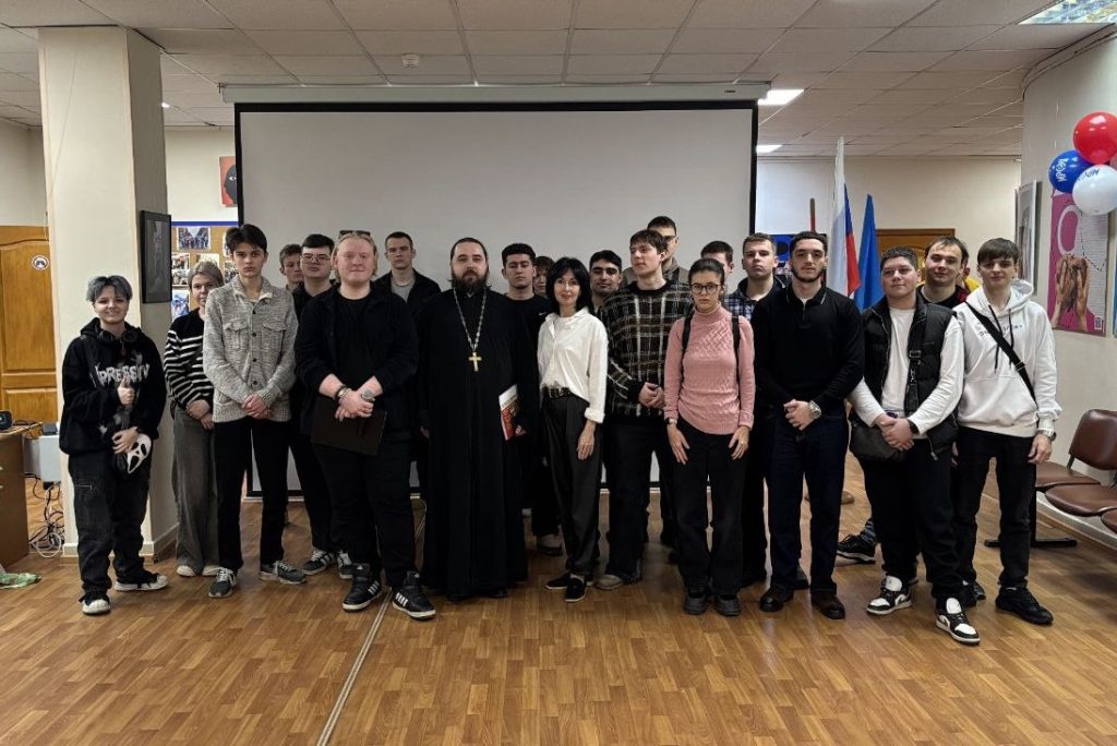 Отец Анатолий поздравил присутствующих с праздником, в своём выступлении призвал чтить память живых и усопших героев нашей страны. В свою очередь преподаватели и студенты поздравили священнослужителя и преподнесли ему в подарок книгу.