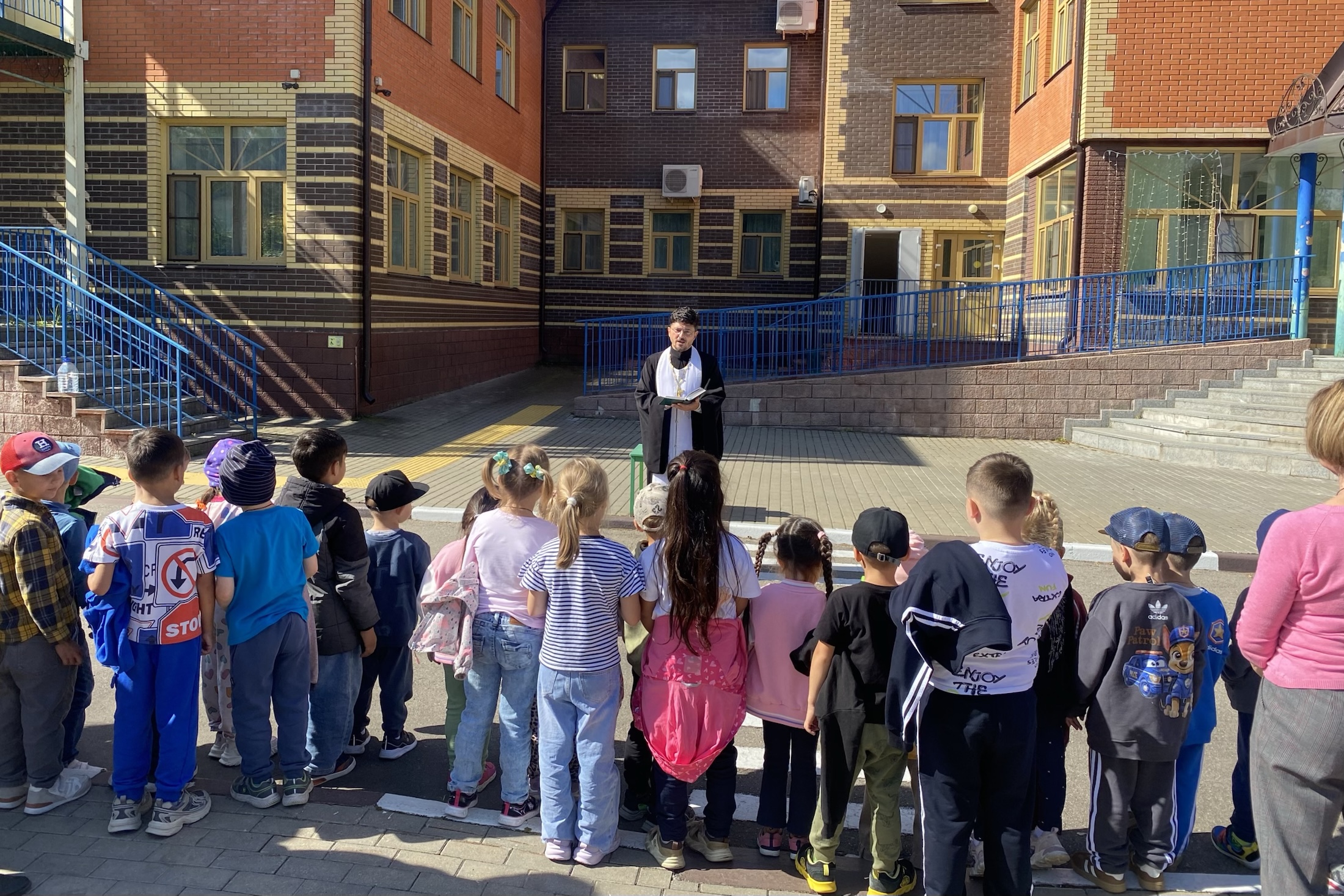 После молебна священник провёл беседу с детьми о молитве, произнёс напутственное слово воспитателям и воспитанникам, затем окропил всех святой водой.