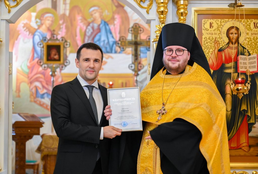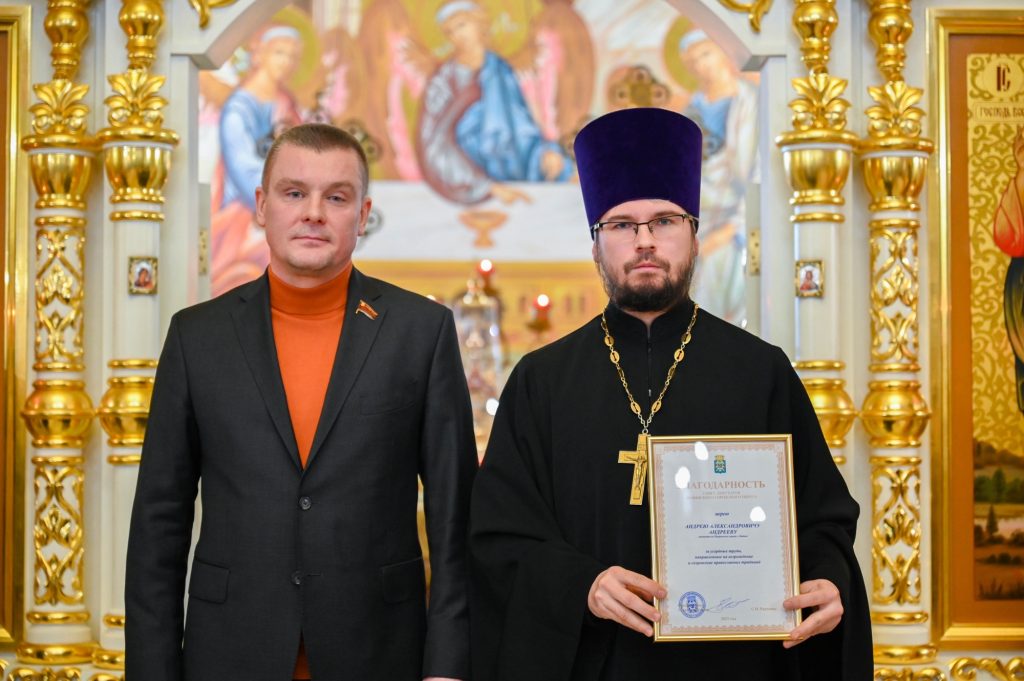 С. Н. Радченко вручил Благодарности Совета депутатов Ленинского г. о. заместителю благочинного иерею Николаю Шапореву, настоятелю Покровского храма г. Видное иерею Андрею Андрееву, клирику Богородицерождественского храма д. Тарычёво иерею Сергию Анискину.