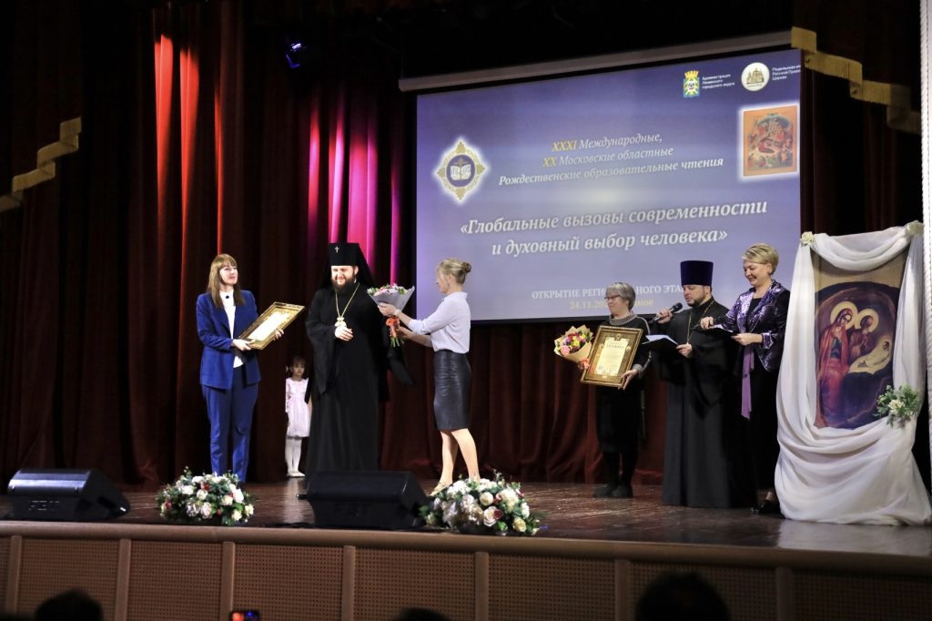 По окончании церемонии открытия Чтений архиепископ Подольский и Люберецкий Аксий выступил с заключительным словом и наградил работников системы образования, жертвенно потрудившихся в деле духовно-нравственного просвещения, архиерейскими грамотами: Болмазову Елену Васильевну, начальника Управления образования администрации городского округа Домодедово; Григорьеву Надежду Викторовну, директора учебно-методического образовательного центра Ленинского городского округа; Ильину Софью Васильевну, директора Малинской средней общеобразовательной школы имени Овсянкина П. М. городского округа Ступино; Ипатову Ирину Ивановну, методиста информационно-методического центра городского округа Ступино; Калинину Веру Владимировну, начальника отдела дополнительного образования Управления образования администрации городского округа Ступино; иерея Димитрия Федорова, клирика Успенского храма г. Видное Ленинского городского округа; Неретину Екатерину Васильевну, методиста информационно-методического центра городского округа Подольск; Новову Ольгу Юрьевну, преподавателя начальных классов православной классической гимназии во имя преподобного Варлаама Серпуховского городского округа Серпухов; Пантюхину Екатерину Анатольевну, исполняющую обязанности председателя Комитета по образованию администрации городского округа Серпухов.