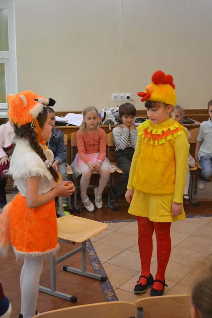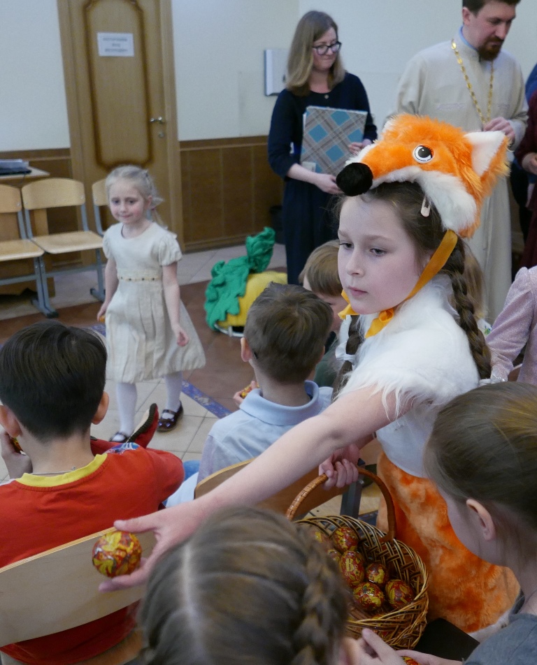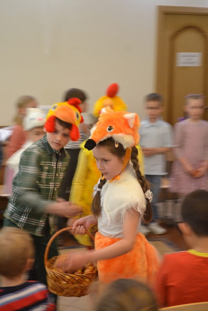 А самые маленькие детки, учащиеся 1 группы, участвовали в спектакле «Пасхальное яичко», где они пели песни под аккомпанемент гитары. Звездой спектакля стала Лиса, игра которой особенно запомнилась зрителям.