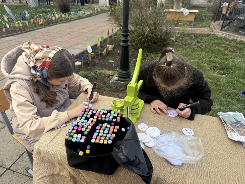 Для желающих применить собственные таланты детей и взрослых работал мастер-класс по изготовлению пасхальных значков. Мамы с детьми, проявляя большое увлечение, придумывали и рисовали авторские семейные геральдические узоры, совмещенные с буквами «ХВ», а папы с удовольствием применяли мужскую силу на станке по сборке значков.