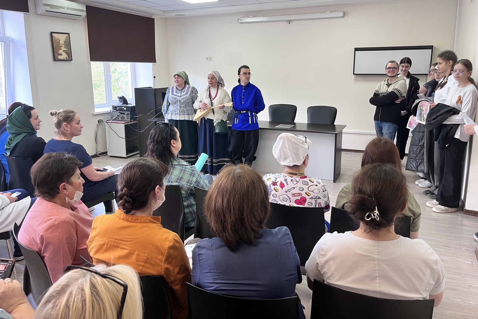 В актовом зале административной части отцы поздравили персонал медицинского учреждения, а народный хор казацкой песни «Терек» исполнил традиционные пасхальные песнопения.