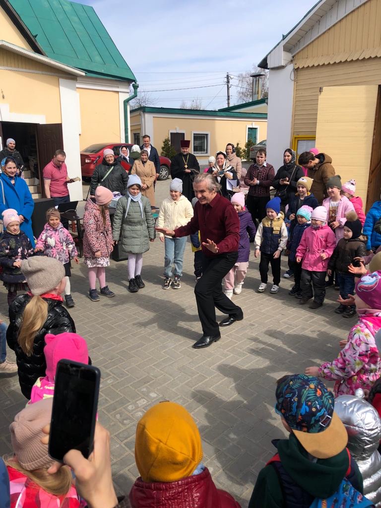 На поздней Божественной Литургии пел хор воскресной школы Никольского храма. А после поздней Литургии состоялся детский праздник с играми, загадками, концертными номерами. Каждый ребенок получил пасхальный подарок. Все желающие смогли подняться на колокольню храма и позвонить в колокола.