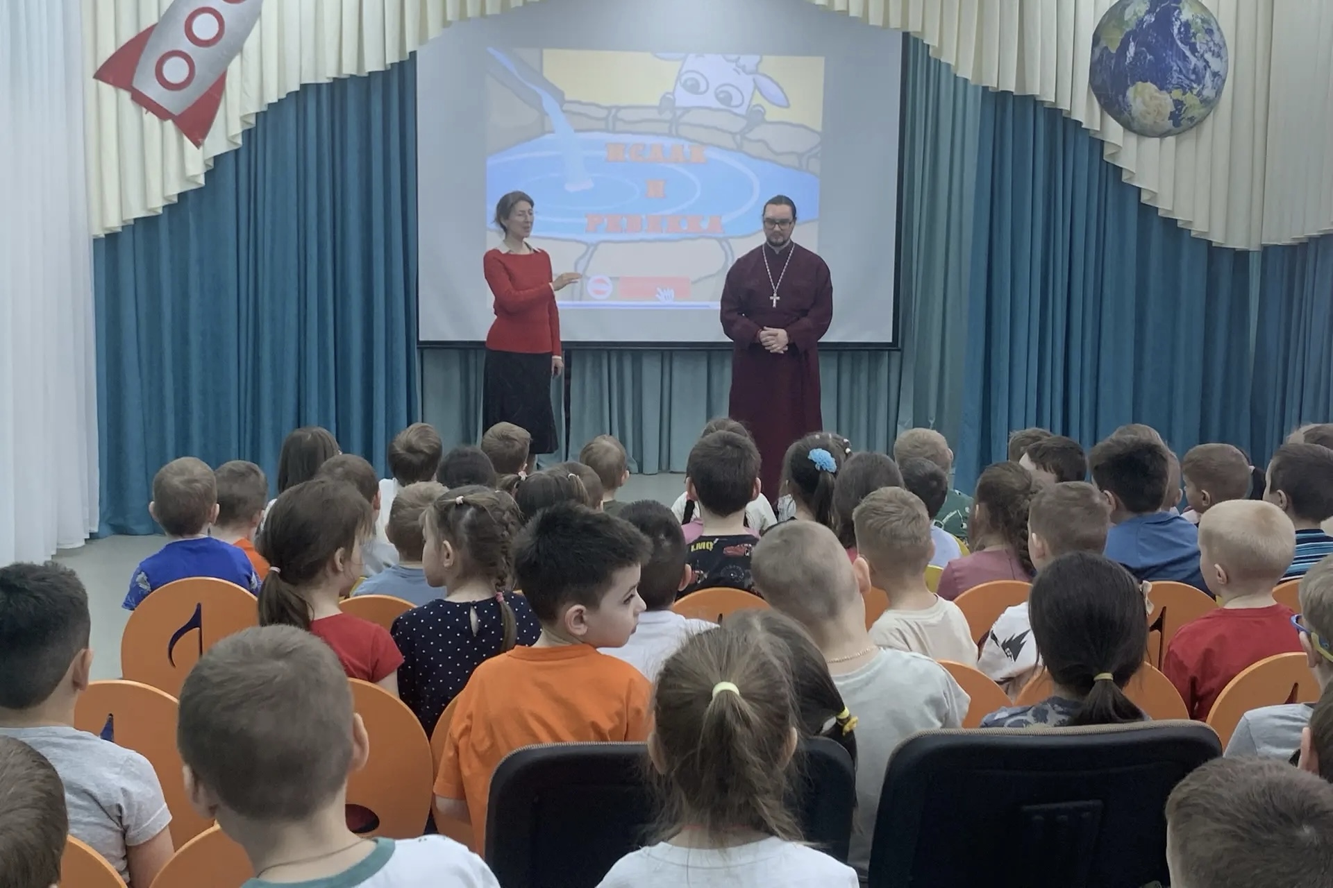 Священник рассказал детям о воскресении Христа, а также показал православный мультфильм, повествующий о праотцах Аврааме и Исааке. Гости пропели для ребят тропарь Пасхи на разных языках.