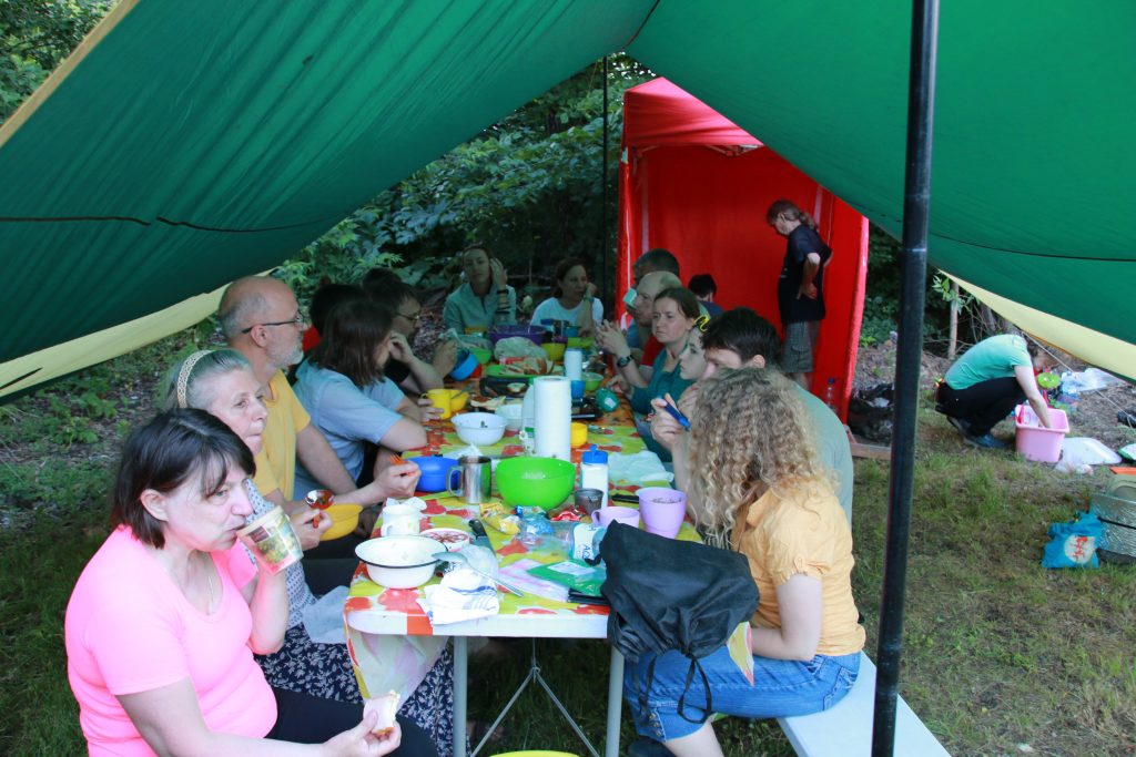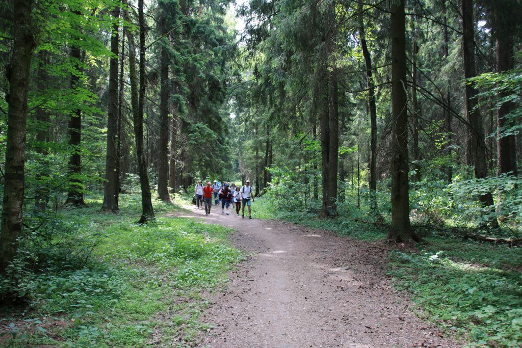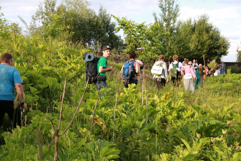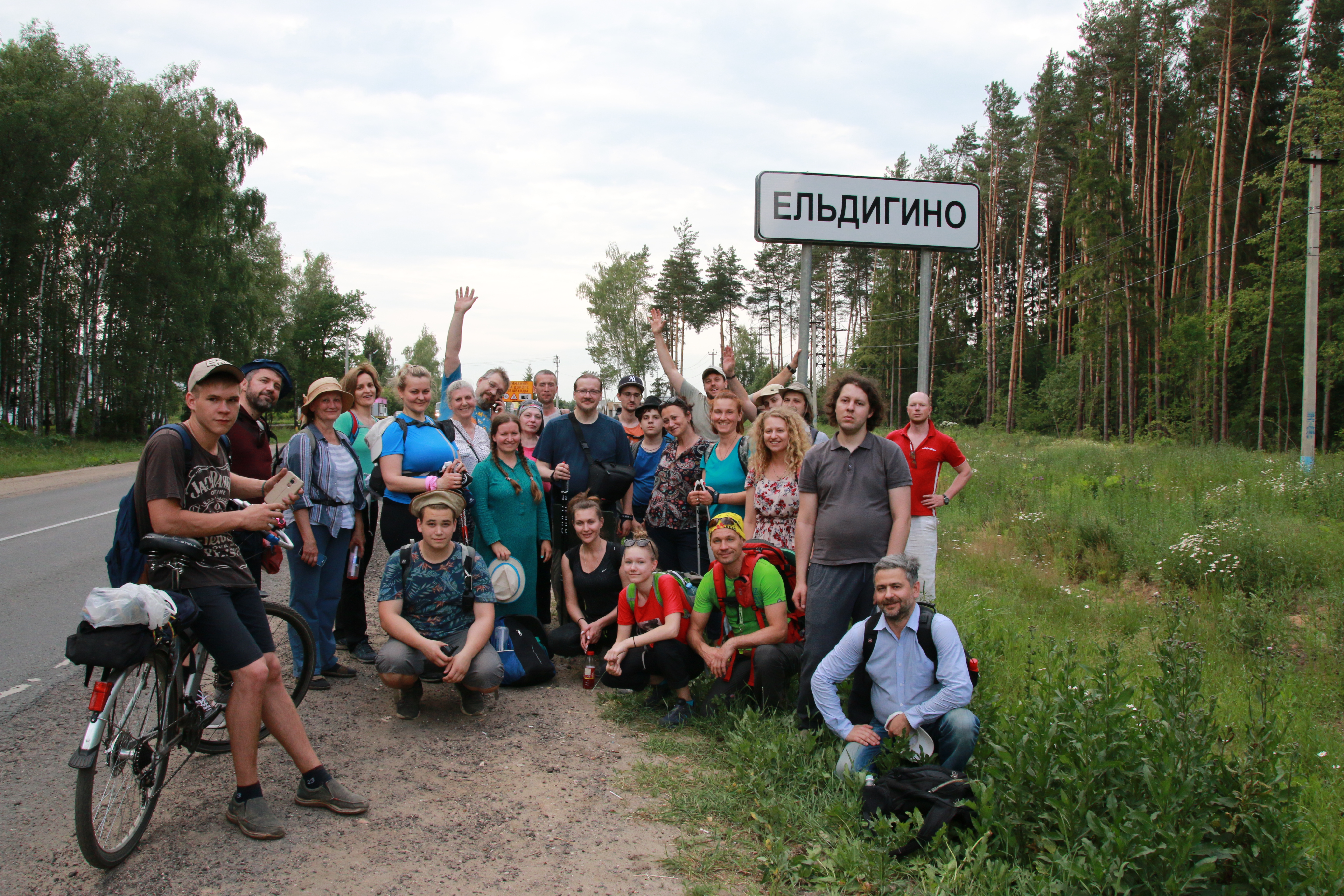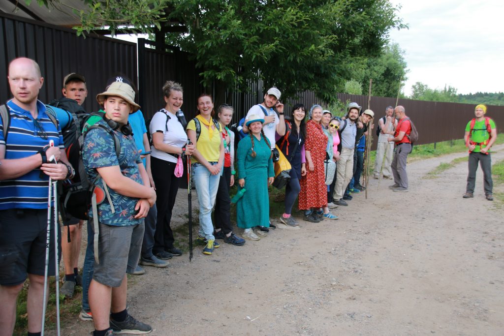 На второй, субботний день паломничества пришлось дежурство прихожан из Развилки. Днем они приготовили для всех обед на берегу небольшого пруда, где многие с удовольствием искупались. Вечером мы поставили палатки на территории Троицкого храма в Ельдигино. Настоятель, протоиерей Александр Грузинов, уже много лет гостеприимно встречает паломников. Утром в воскресенье после литургии опять взяли рюкзаки и отправились в путь.