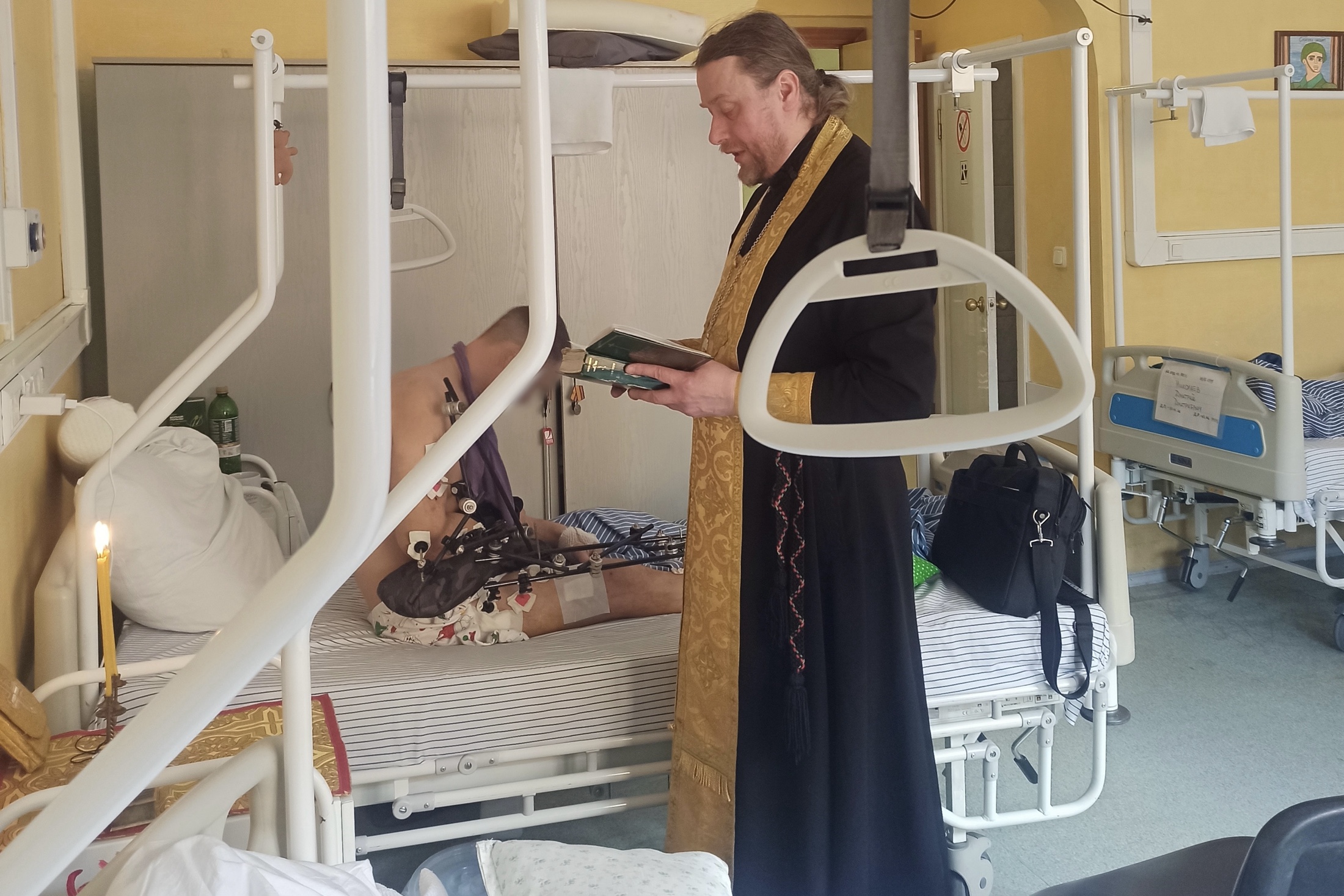 В домовом храме в честь апостолов Петра и Павла при госпитале отец Михаил вместе с ответственным за госпитальное служение клириком храма иереем Илией Тягиным совершили молебен святителю Луке Крымскому. Затем отец Михаил посетил реанимационное и психиатрическое отделения, где провёл беседы с военнослужащими, совершил таинства Крещения, Исповеди и Причастия.