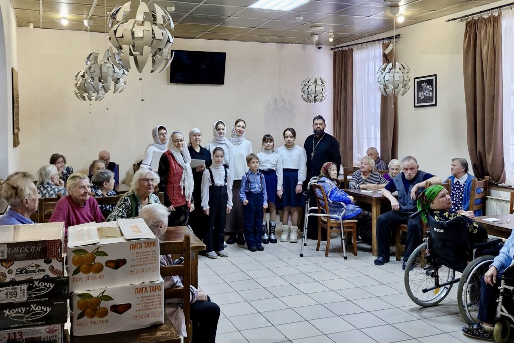 Под руководством регента храма Т.Д. Фокиной певчие спели колядки. После небольшого концерта дети вручили бабушкам и дедушкам угощения.