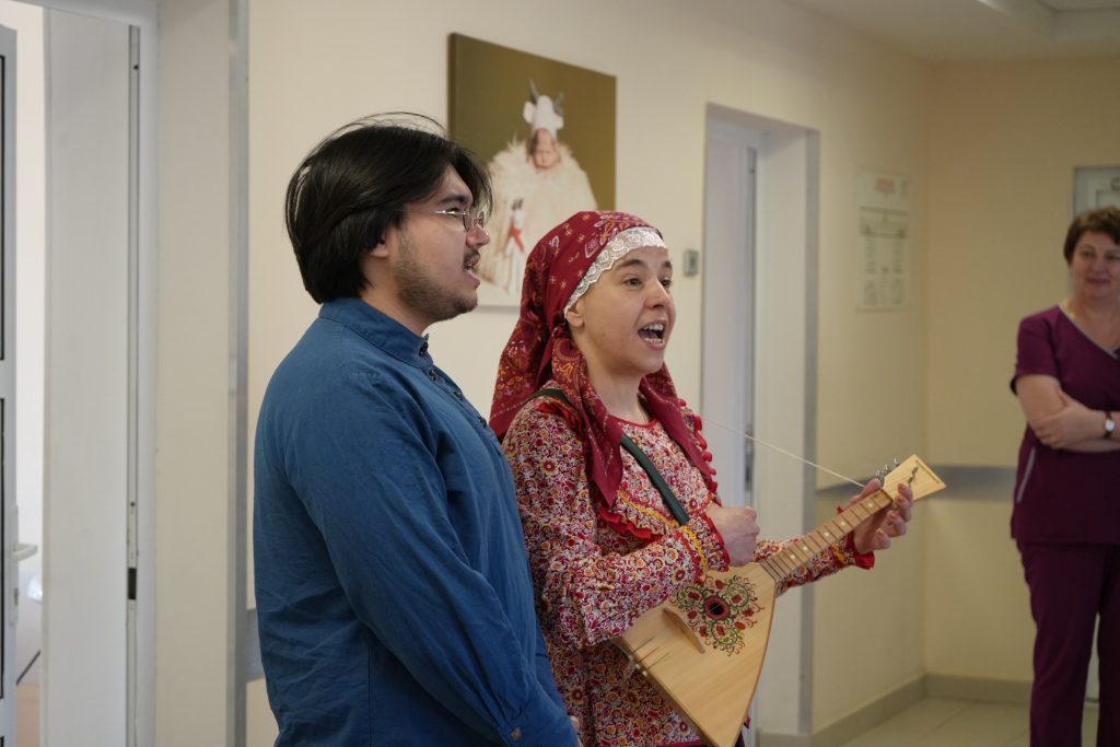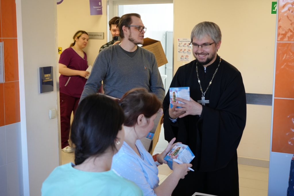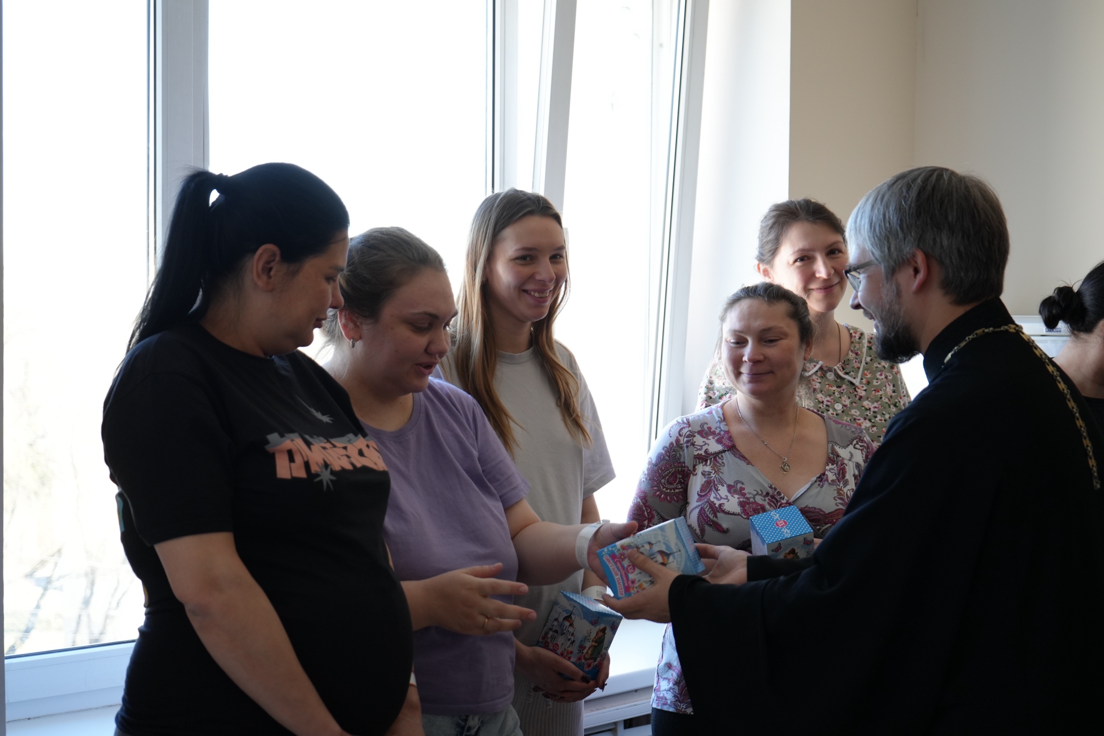 22 апреля ответственный Епархиальной комиссии по вопросам семьи, защиты материнства и детства, настоятель Покровского храма в ЖК «Зелёные аллеи» города Видное иерей Андрей Андреев вместе с представителями молодёжной православной среды «Прозелит» Видновского благочиния и с фольклорным ансамблем «Терек» Центра культуры посёлка Совхоза им. Ленина поздравили сотрудников и пациенток Видновского перинатального центра с праздником Светлого Христова Воскресения.