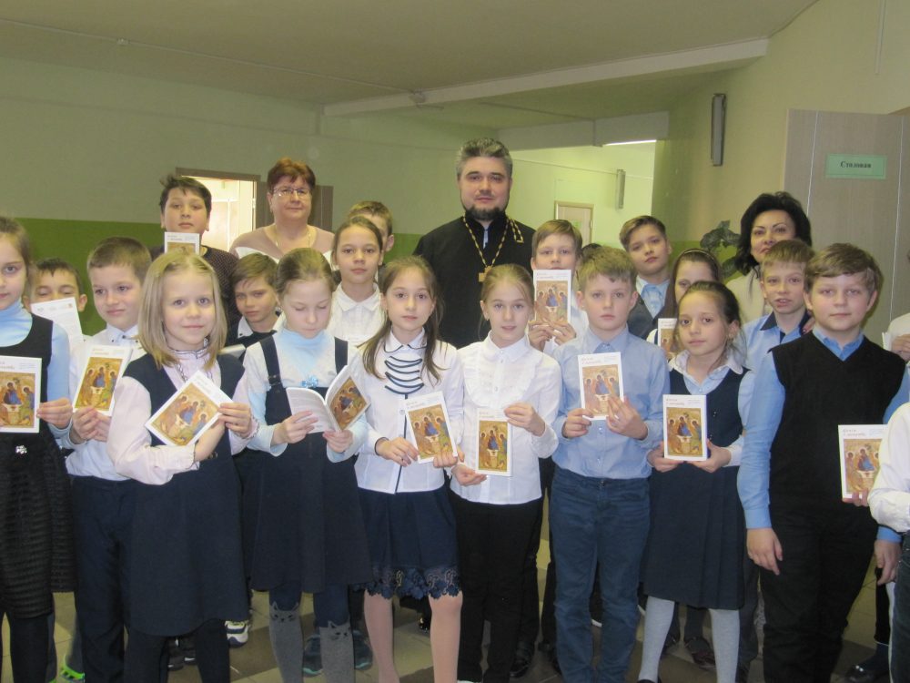 14 марта, в День православной книги, протоиерей Виктор Ястремский, настоятель Никольского храма с. Ермолино, пришёл в гости к ребятам из 3-4-х классов Калиновской средней школы.