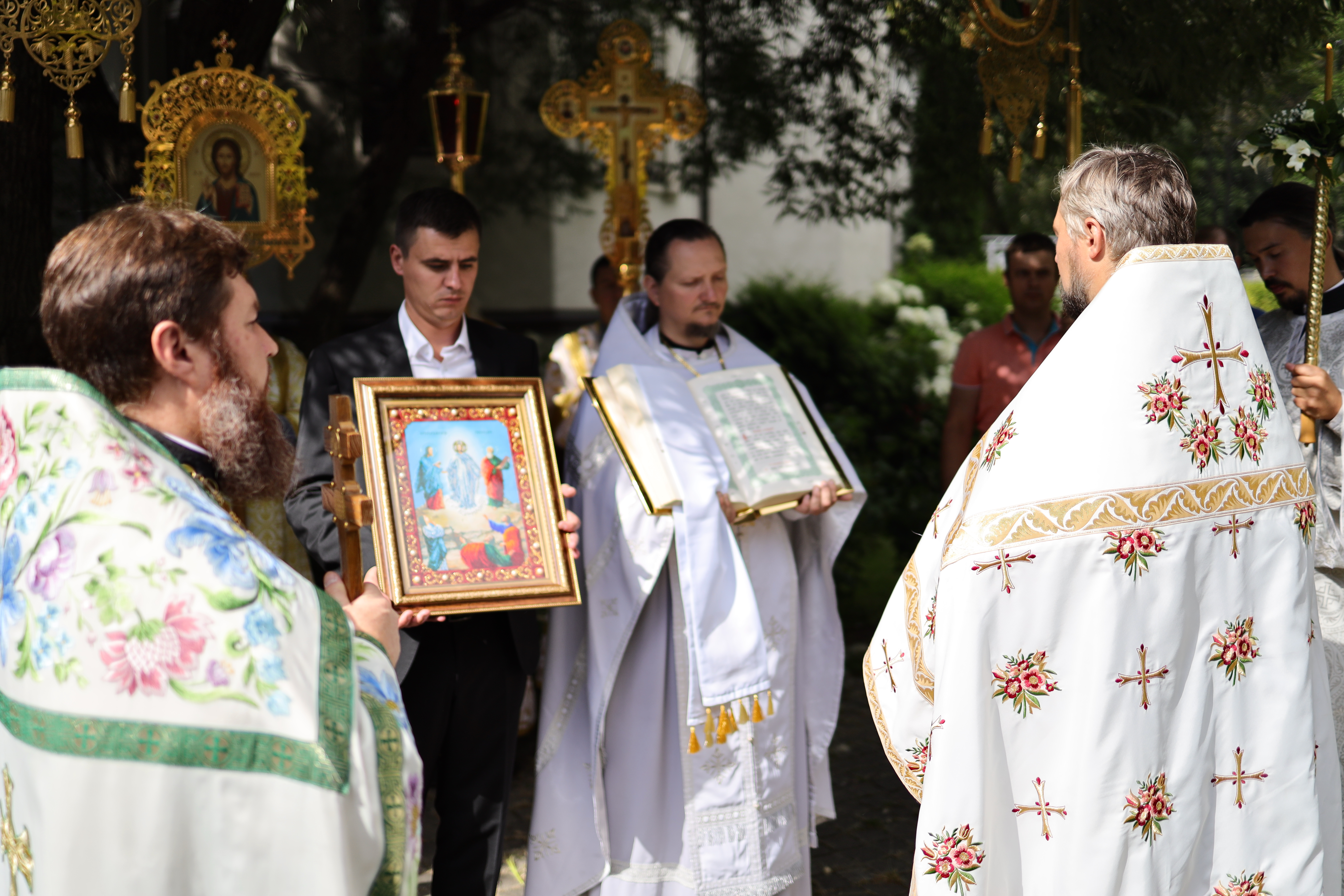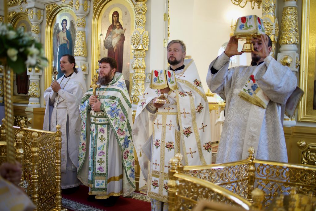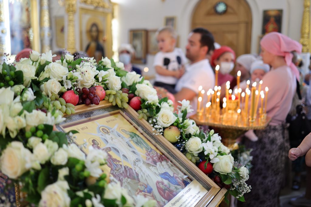 После Божественной литургии верующие прошли праздничным Крестным ходом, затем состоялся благодарственный молебен освящения плодов нового урожая.