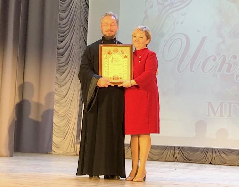 Настоятель Никольского храма п. Володарского протоиерей Сергий Свалов вручил грамоту Видновского благочиния преподавательскому коллективу в лице директора школы Ивановой Любовь Витальевны.