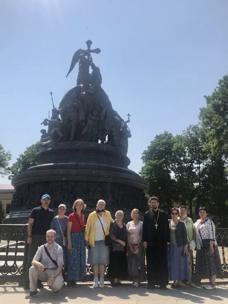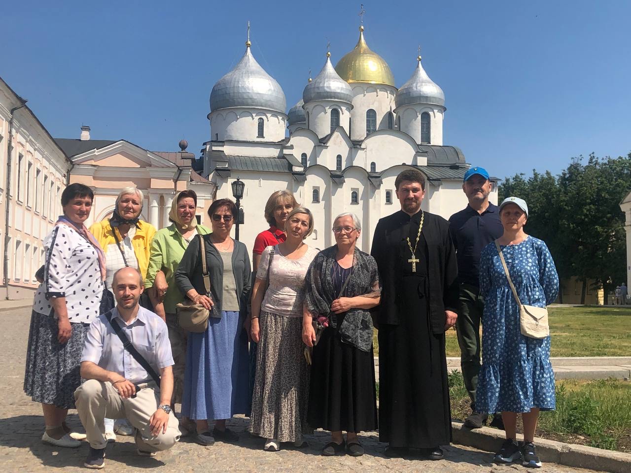 По дороге в Псково-Печерский монастырь паломники заехали в Софийский собор Новгородского кремля, где помолились у иконы Божией Матери «Знамение» и приложились к святыням храма.