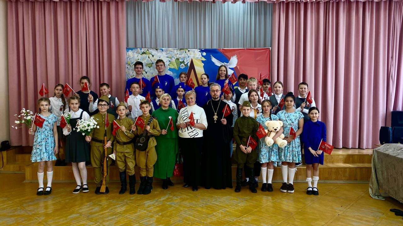 В этот же день настоятель Никольского храма протоиерей Сергий Свалов принял участие в торжественной линейке Володарской средней школы, посвящённой 80-летию победы в Великой Отечественной войне.