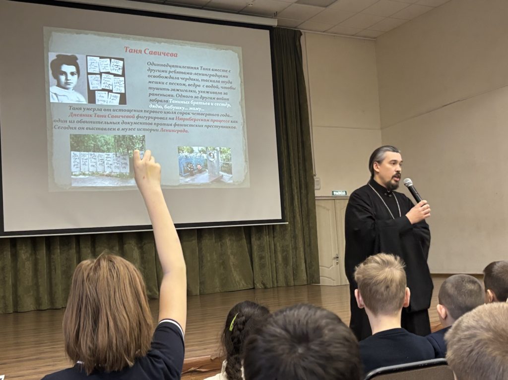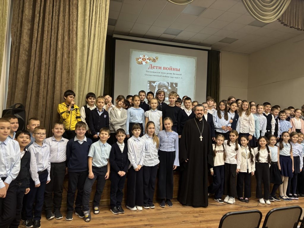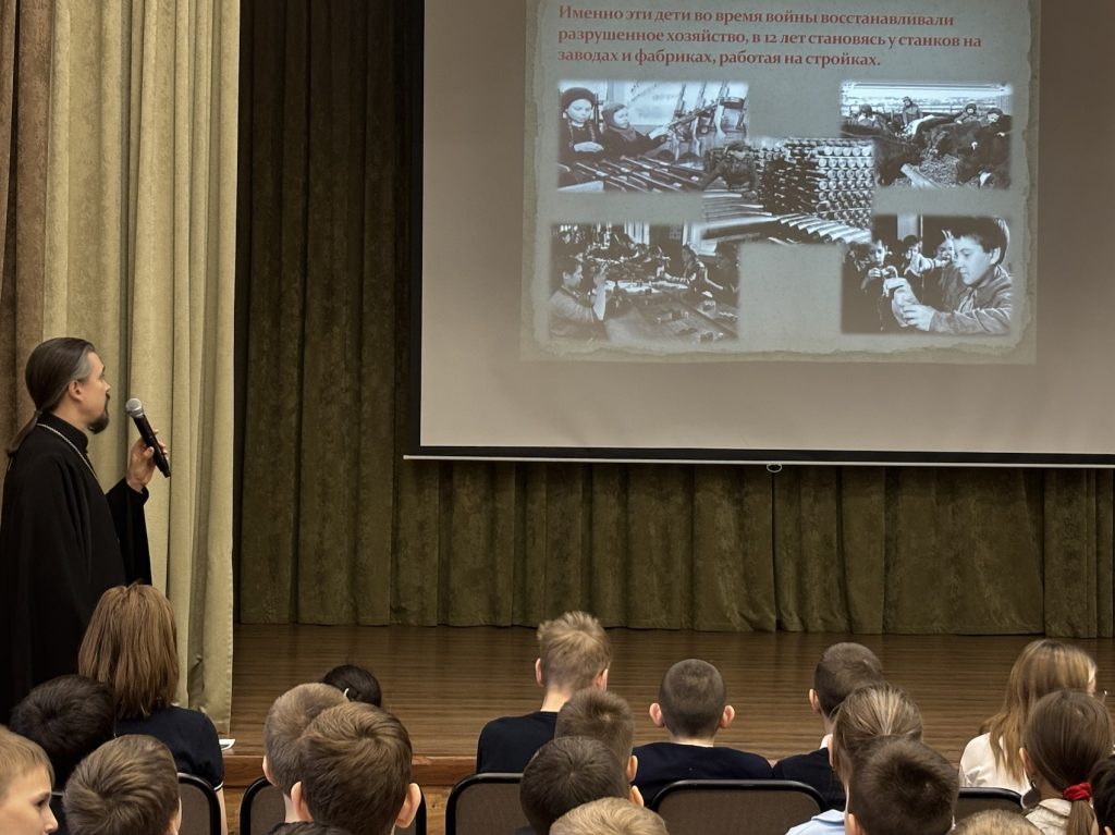 3 декабря 2024 года в рамках XXII Рождественских образовательных чтений в Ленинском городском округе ответственный по делам молодёжи в Видновском благочинии иерей Александр Тарабрин провел урок для учеников четвертых классов Видновского художественно-технического лицея. Тема встречи: «Дети войны».