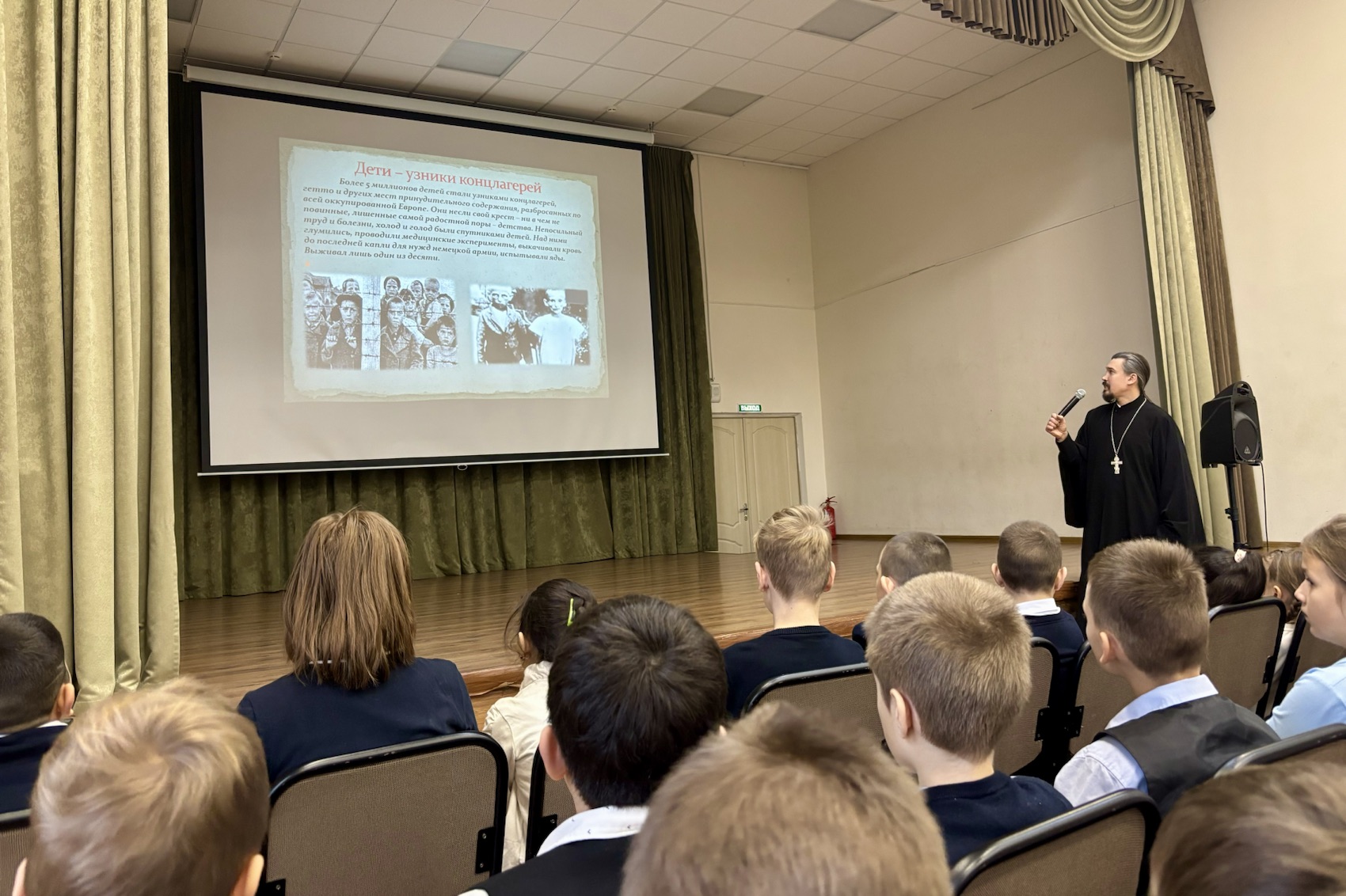Священник рассказал о жизни детей во время Великой Отечественной войны, об их помощи армии, работе в тылу на фабриках и заводах, а также о детях, находившихся во время войны в концлагерях. Отец Александр подчеркнул важность их подвига и сохранения памяти об этом подвиге, призвал школьников следовать примеру детей военной поры и ежедневно совершать свои маленькие подвиги – творить добрые дела. Ребята задали гостю вопросы и поблагодарили за проведённый урок.