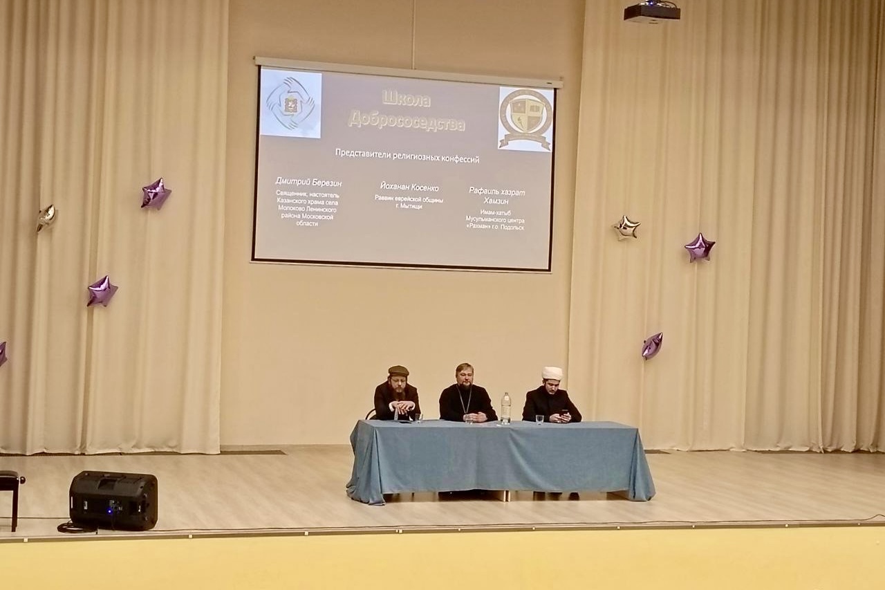 28 ноября 2023 года в Мисайловской школе ЖК «Пригород лесное» Ленинского г.о. прошел открытый урок «Школы добрососедства» для старшеклассников. Представители трех авраамических религий отвечали на вопросы о Боге, вере, нравственных законах, уделив особое внимание добродетелям.