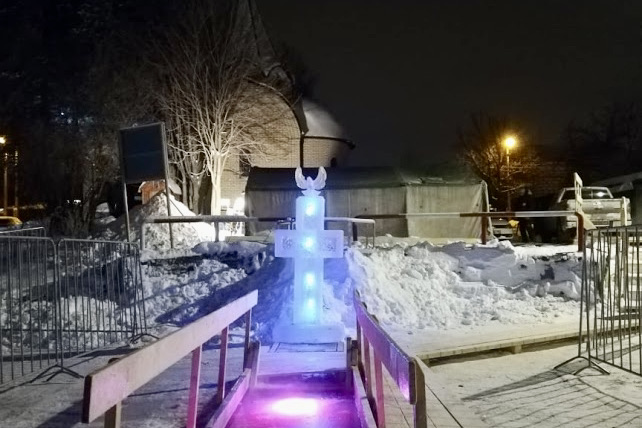 18 января настоятель Никольского храма пос. Володарского прот. Сергий Свалов совершил чин Великого освящения воды в купели на реке Пахра, также разъяснив собравшимся смысл праздника Крещения и благочестивой традиции окунания в иордани.