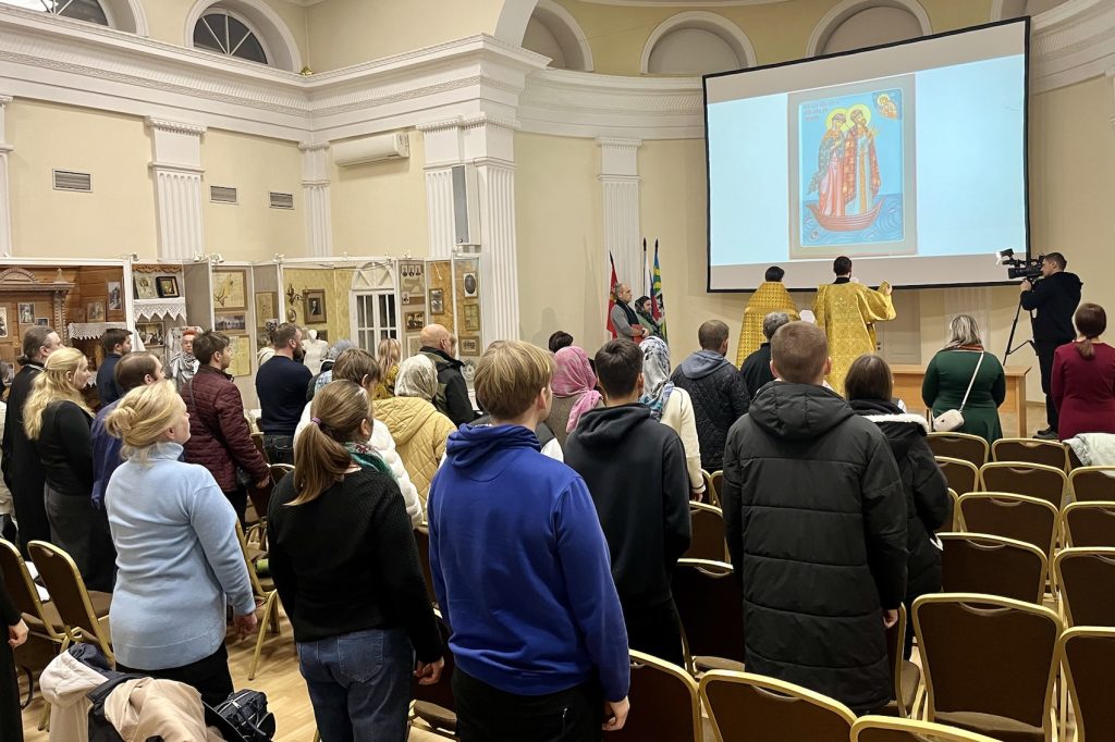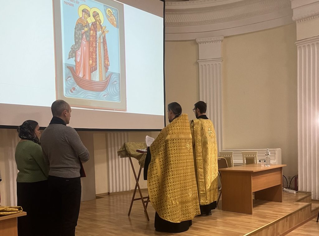 Перед началом встречи ответственный Епархиального отдела по делам молодёжи Подольской епархии в Видновском благочинии иерей Александр Тарабрин в сослужении клирика Успенского храма г. Видное диакона Андрея Плехова совершили молебен о семейном благополучии. Песнопения исполнял хор Успенского храма г. Видное под руководством В. Ланского.