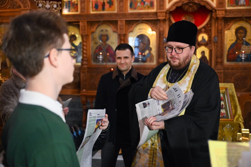 После экскурсии по храму о. Софроний подарил гостям православную газету «Мирянин», которая содержит материал о том, как священнослужители благочиния и Подольской епархии участвуют в гуманитарной помощи и пастырском окормлении военнослужащих СВО.