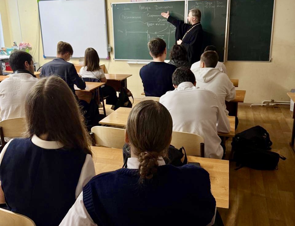 14 ноября в рамках проекта «Диалог со священником» в Молоковской средней школе Ленинского г.о. состоялась встреча со старшеклассниками. Настоятель Казанского храма села Молоково иерей Димитрий Березин провёл урок для учеников 10-х классов на тему: «Смысл жизни». Занятие прошло в форме лекции и параллельной беседы с учащимися, с ответами на их вопросы.