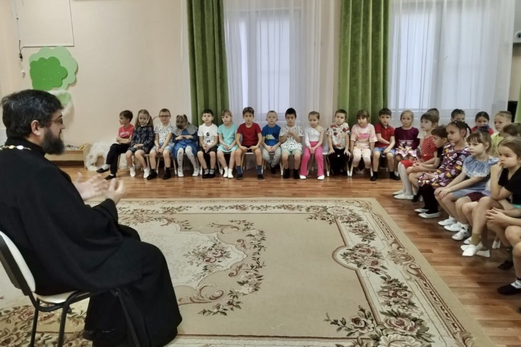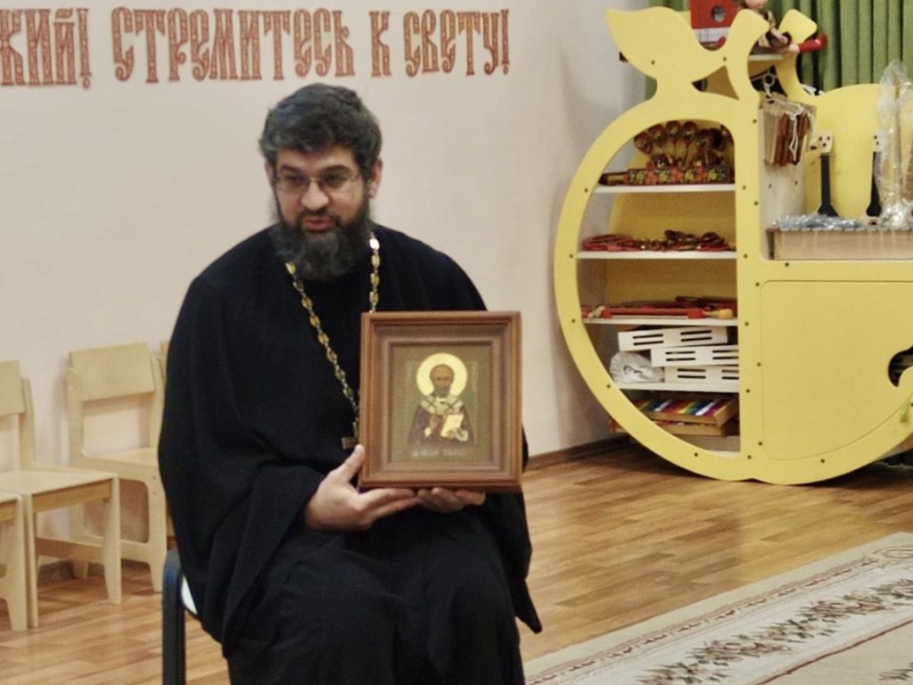 10 декабря в рамках реализации епархиального проекта «Добрый сад» в дошкольном отделении «Жар-птица» деревни Лопатино Ленинского г.о. настоятель храма святителя Димитрия Ростовского деревни Суханово иерей Владимир Богодист провёл встречу с детьми и рассказал им о Рождественском посте, его значении и смысле. Также отец Владимир показал воспитанникам старинную храмовую икону святителя Николая Чудотворца, рассказал о святителе и о праздновании его памяти Рождественским постом.