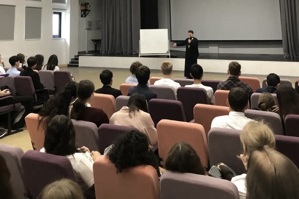 Перед учениками 9-11 классов выступил иерей Николай Шапорев, настоятель Александро-Невского храма г. Видное. Он рассказал старшеклассникам о содержании и тематике встреч, которые будут проходить в течение учебного года раз в месяц, а затем побеседовал с молодёжью на тему: «Свобода человека» — чем отличается свобода от вседозволенности? не ограничивает ли Бог свободу человека своими заповедями? почему верующих называют рабами Божиими? для чего нужна свобода человеку? На эти и другие вопросы ребята искали ответы вместе со священником.