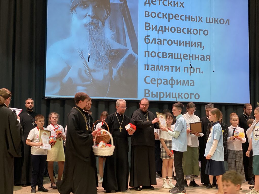 Кульминацией стало оглашение результатов состязания председателем жюри, заместителем благочинного и настоятелем Александро-Невского храма г. Видное священником Николаем Шапоревым. Третий год подряд победу одерживает сильнейшая команда «Светоч», и ее капитан Дарья Малахова также трижды становится лучшей в конкурсе капитанов, ее поощрили билетом в подмосковный аквапарк, в котором она может провести весь день. Второе место — у команды «Парадигма», третье — у «Логоса». Благочинный Видновского церковного округа иеромонах Софроний (Горохольский), поздравляя учеников воскресных школ и их преподавателей, вручил командам-победителям грамоты Видновского благочиния, медали, кубки, билеты в Московский планетарий и сладкие подарки. Сразу два кубка — за домашнее задание и актерское мастерство Никиты Литвинова — вручены команде «Миротворцы». Все дети, участвовавшие в олимпиаде, также получили грамоты.