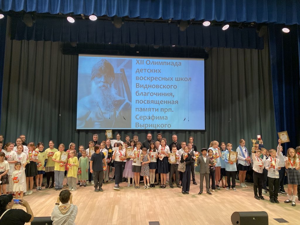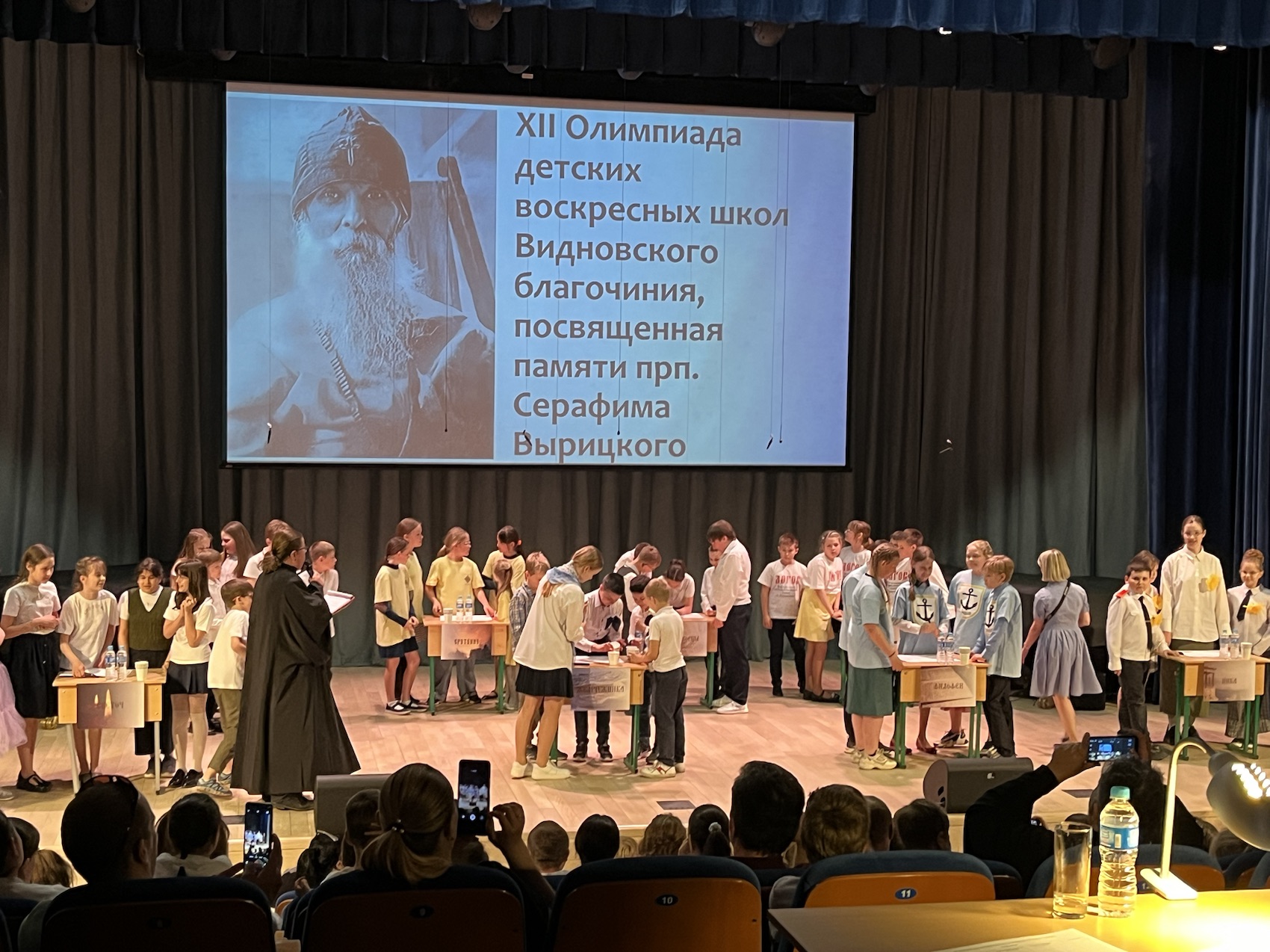 В воскресенье, 26 мая, в зале Видновской детской школы искусств прошла XII олимпиада детских воскресных школ Видновского благочиния, посвященная памяти преподобного Серафима Вырицкого, 75-летие преставления которого отмечается в этом году. По традиции олимпиада проверила знания по предметам, изучаемым в воскресных школах: священной истории Ветхого и Нового заветов, литургике. Домашнее задание, конкурс капитанов и впервые проведенное соревнование по визуальным загадкам сделали олимпиаду еще интереснее.
